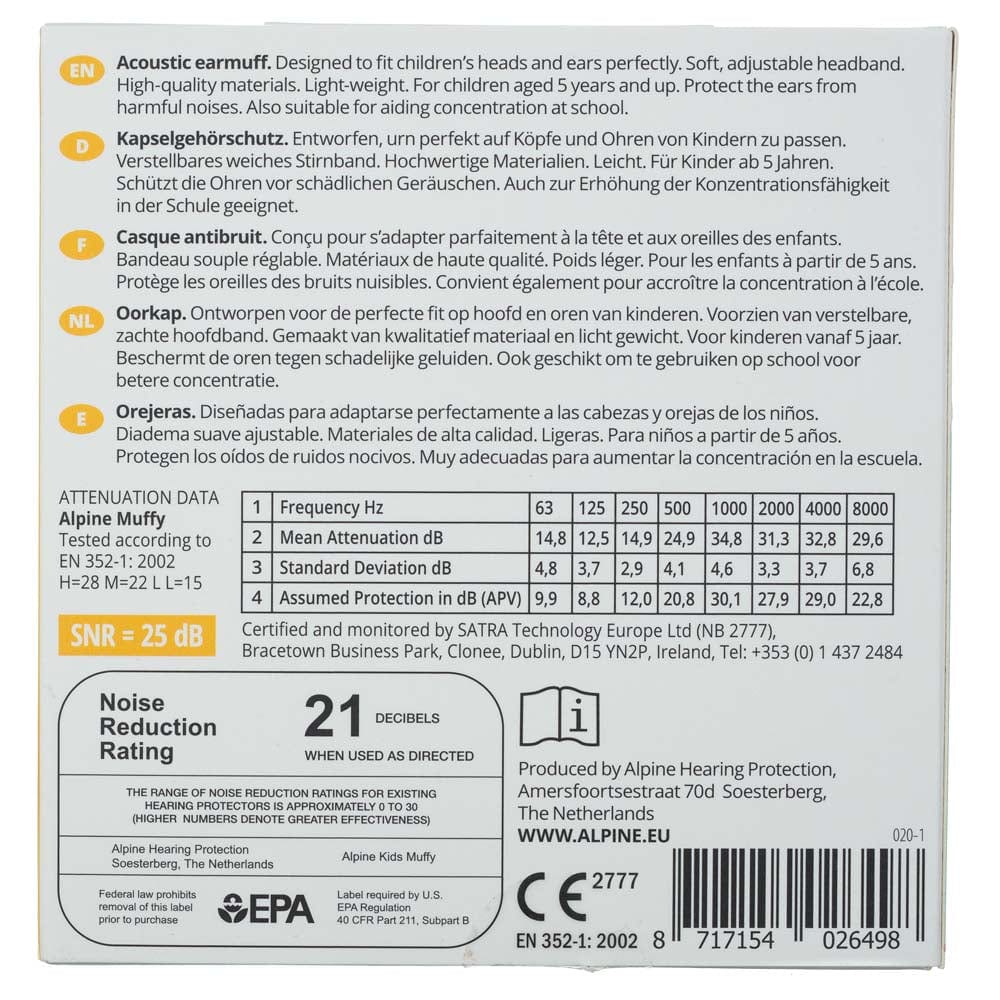 Alpine Muffy Kids is designed to protect the extra sensitive hearing of children aged 5 to 16 against damaging noise. The earmuffs can be used in noisy environments, such as parties, parades, fireworks shows, concerts, and car and motorcycle races. The small earmuffs for children also provide noise reduction to improve concentration, for instance in noisy classrooms. The headband is adjustable and features a soft lining. Alpine Muffy Kids earmuffs are available in five new, trendy colours. The outer layer of the colourful earmuffs is made from plastic and therefore easy to clean. The earmuffs can be folded, so they are easy to take along. Make your child feel comfortable and safe.