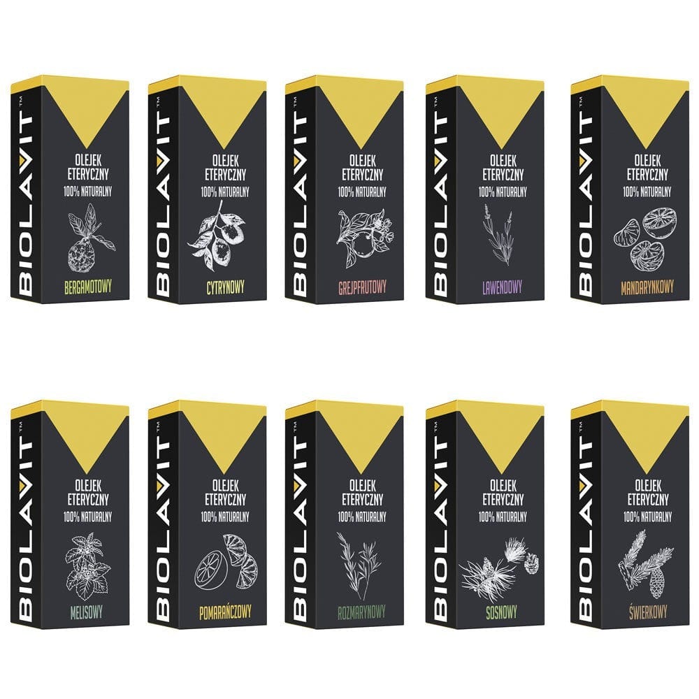 Set of 10 essential oils by Bilovit. The set includes bergamot, lemon, grapefruit, lavender, mandarin, lemon balm, orange, rosemary, spruce, and pine oils.