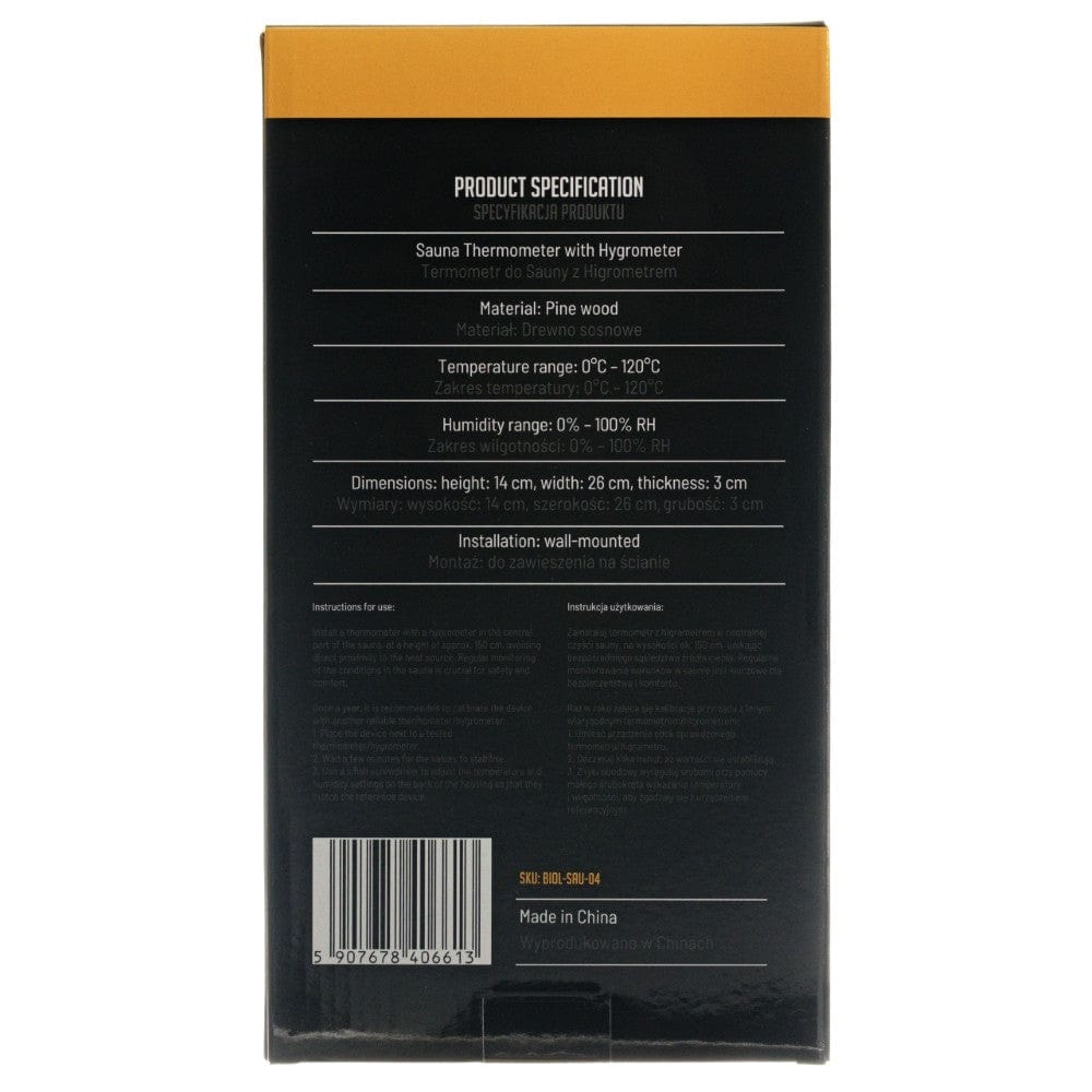 The Bilovit thermometer with hygrometer is a precise measuring device for the sauna, made of pine wood that does not heat up during use. It measures temperature from 0 to 120°C and humidity from 0 to 100%, allowing you to control optimal sauna conditions. Its minimalist design fits into any type of sauna, and the rear attachment allows it to be securely mounted on the wall. Ideal for those who value comfort and precision during sauna sessions.