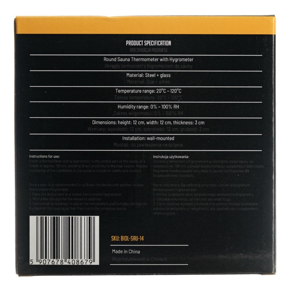 The Bilovit Round Sauna Thermometer with Hygrometer is an elegant tool for accurately measuring temperature (20-120 °C) and humidity (0-100%) in the sauna. Made of durable steel and glass, it ensures longevity and a stylish appearance. Its compact dimensions (12 x 12 x 3 cm) and easy installation at a height of 150 cm make it the perfect addition to any sauna, guaranteeing comfortable and safe sauntering.