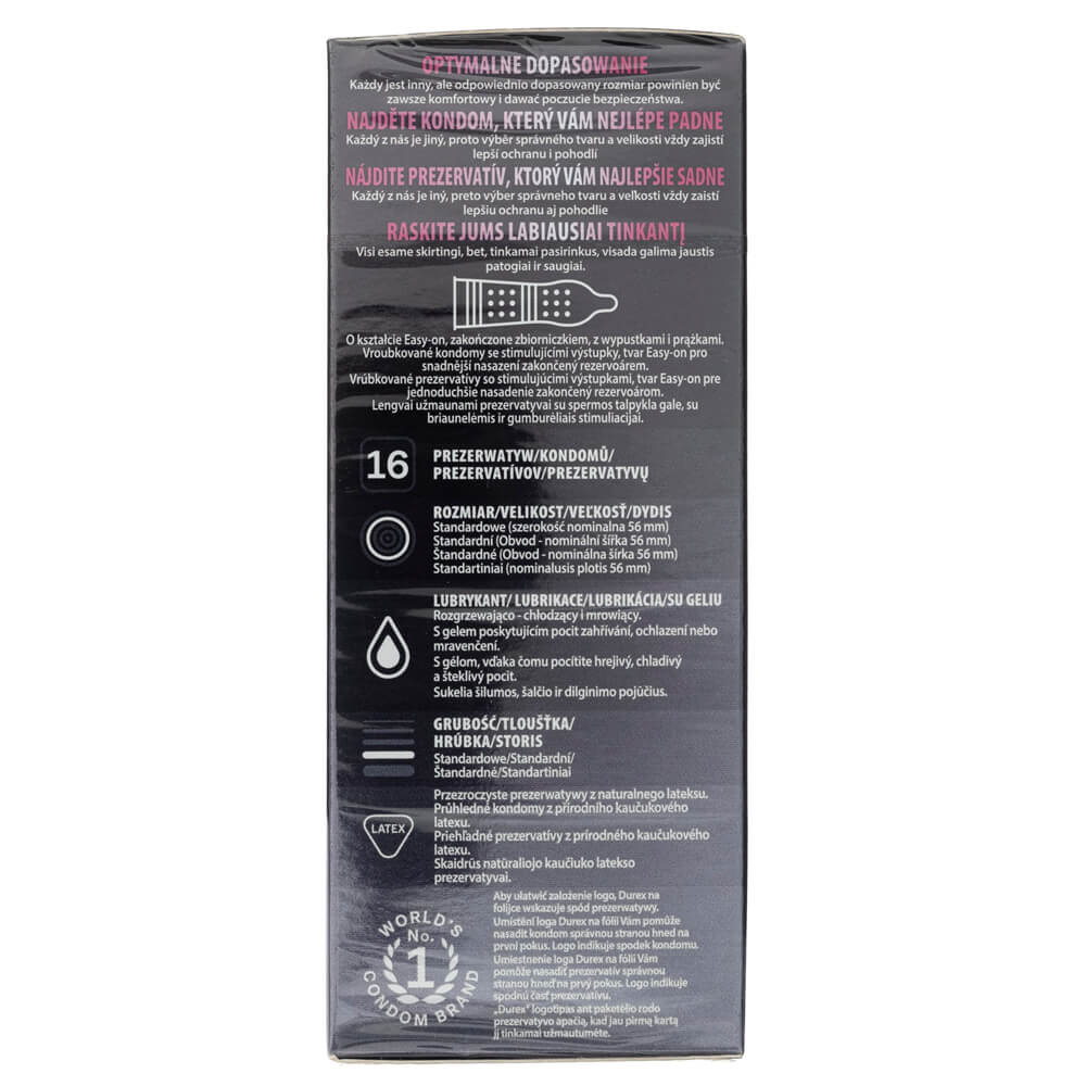 Preservatives Durex Intense Orgasmic with tabs and striations, and stimulating Intense gel provide more intense sensations for her and satisfaction for both of you.