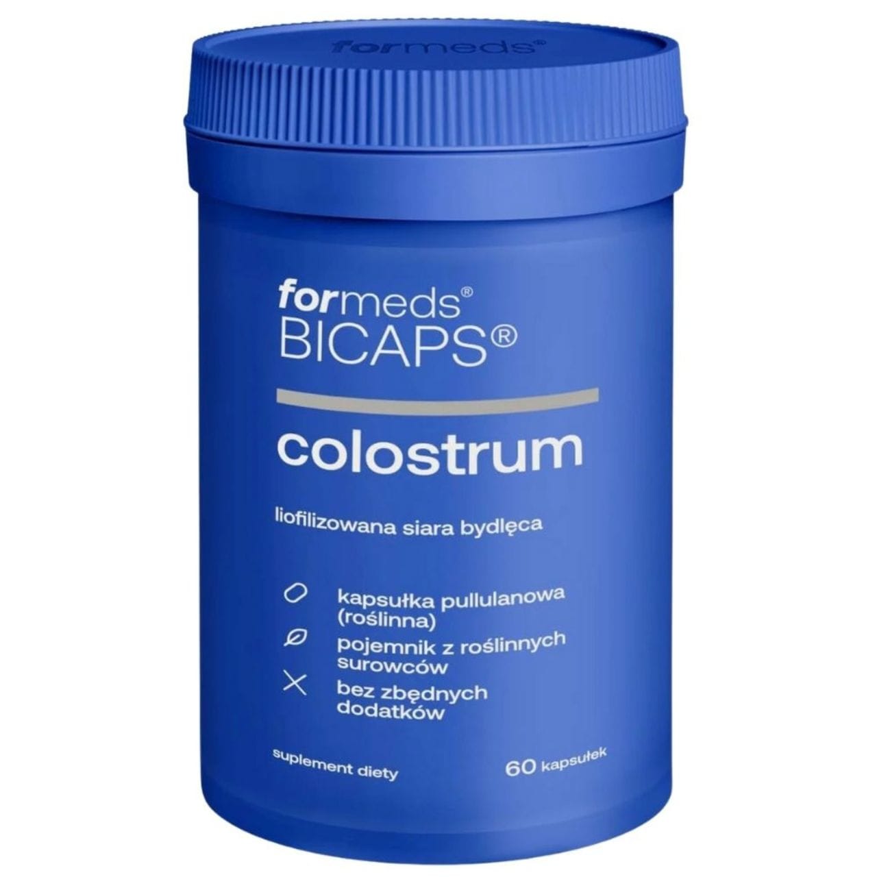 Formeds Bicaps Colostrum is a dietary supplement in capsule form. It is a source of freeze-dried bovine colostrum, obtained within the first 24 hours after birth. This ensures that it retains its full stability and biological activity. Colostrum standardised for immunoglobulins (30%), lactoferrin (2.5%) and polypeptides rich in proline (2%).