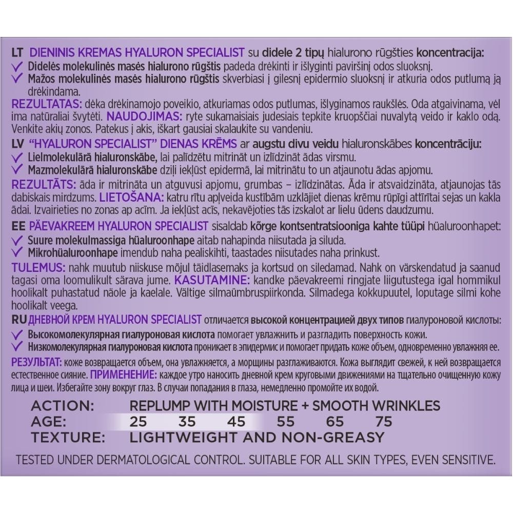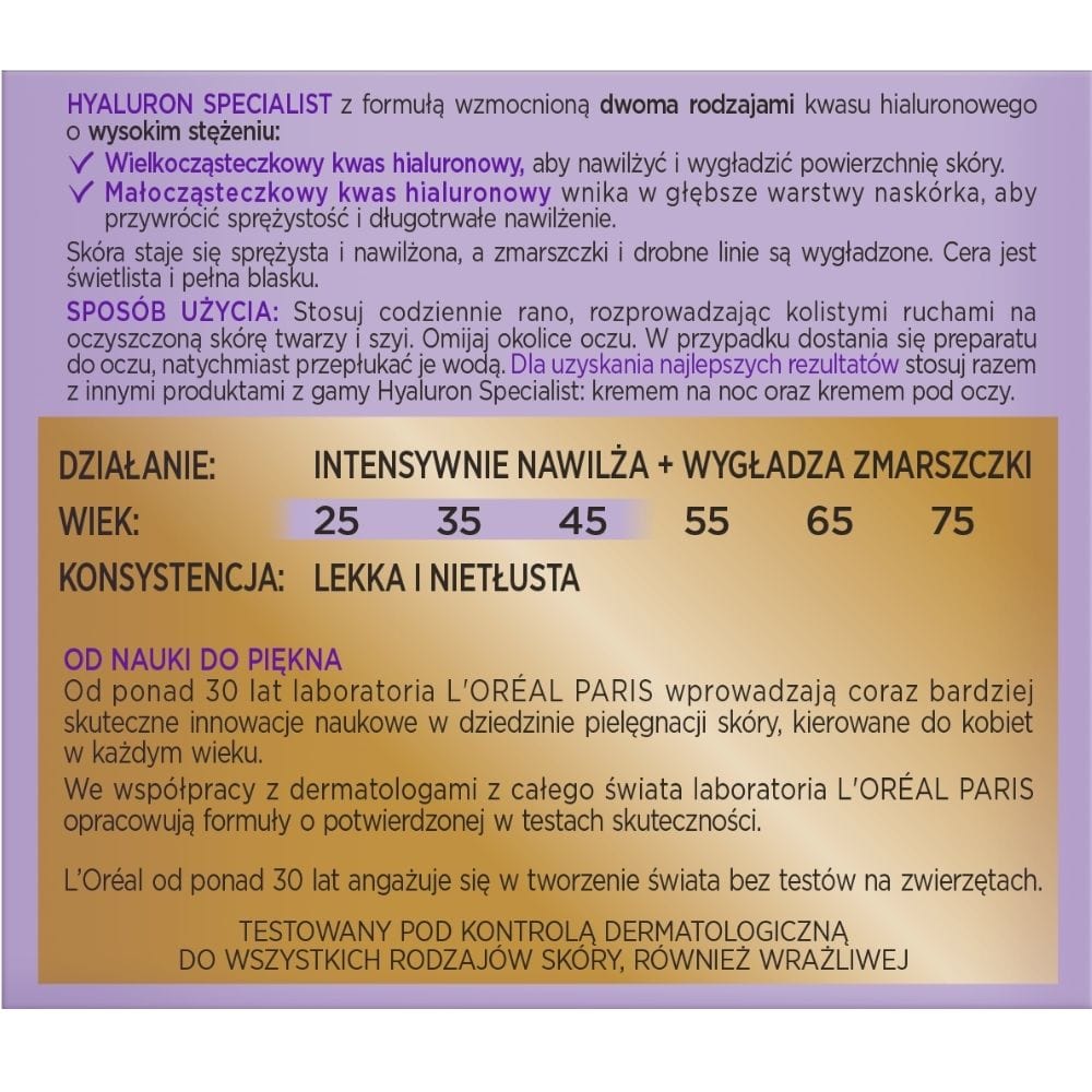Hyaluron Specialist moisturising day cream is an innovative product developed by L'Oréal Paris Laboratories as part of its restorative moisturising care. It responds to the needs of women who want to keep their skin looking young and fresh, effectively fighting the first signs of ageing and providing protection from the sun's harmful rays.