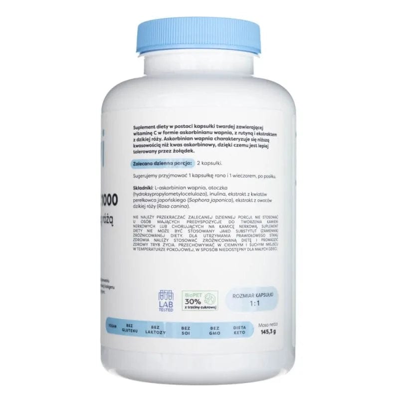 Dietary supplement in capsule form, containing vitamin C in the form of calcium ascorbate, with rutin and rosehip extract. Calcium ascorbate has a lower acidity than ascorbic acid and is therefore better tolerated by the stomach.