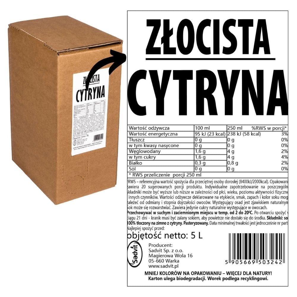 Sadvit Lemon Juice Golden Lemon 100% is NFC (not from concentrate) cold-pressed juice containing only lemons. Pasteurised, with no added sugar or flavour enhancers.
