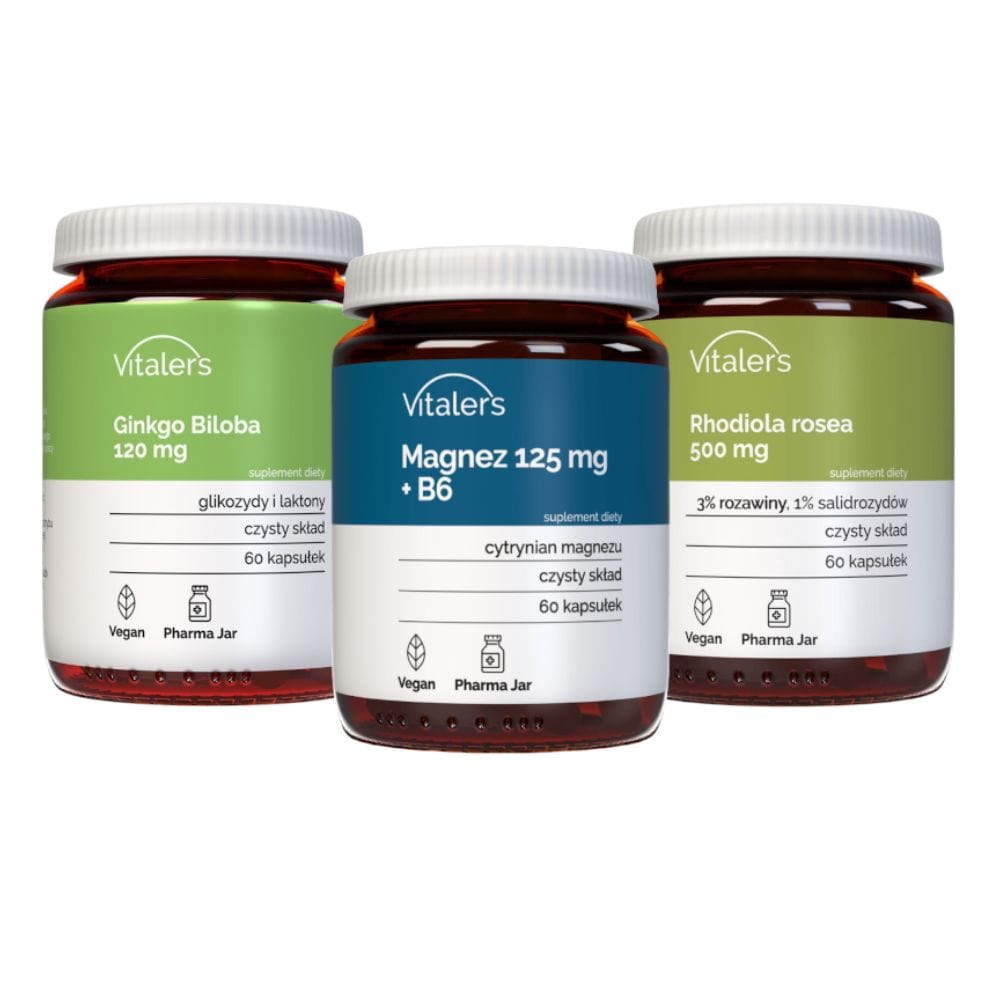 Take care of your nervous system with Vitaler's Anti-stress Kit. Magnesium with Vitamin B6 contributes to the normal functioning of the nervous system and helps to maintain normal psychological functions. Ginkgo Biloba and Rhodiola are natural plant ingredients that enrich the diet with valuable substances. This combination is ideal for those looking for support in daily functioning. Choose Vitaler's and support your body every day!