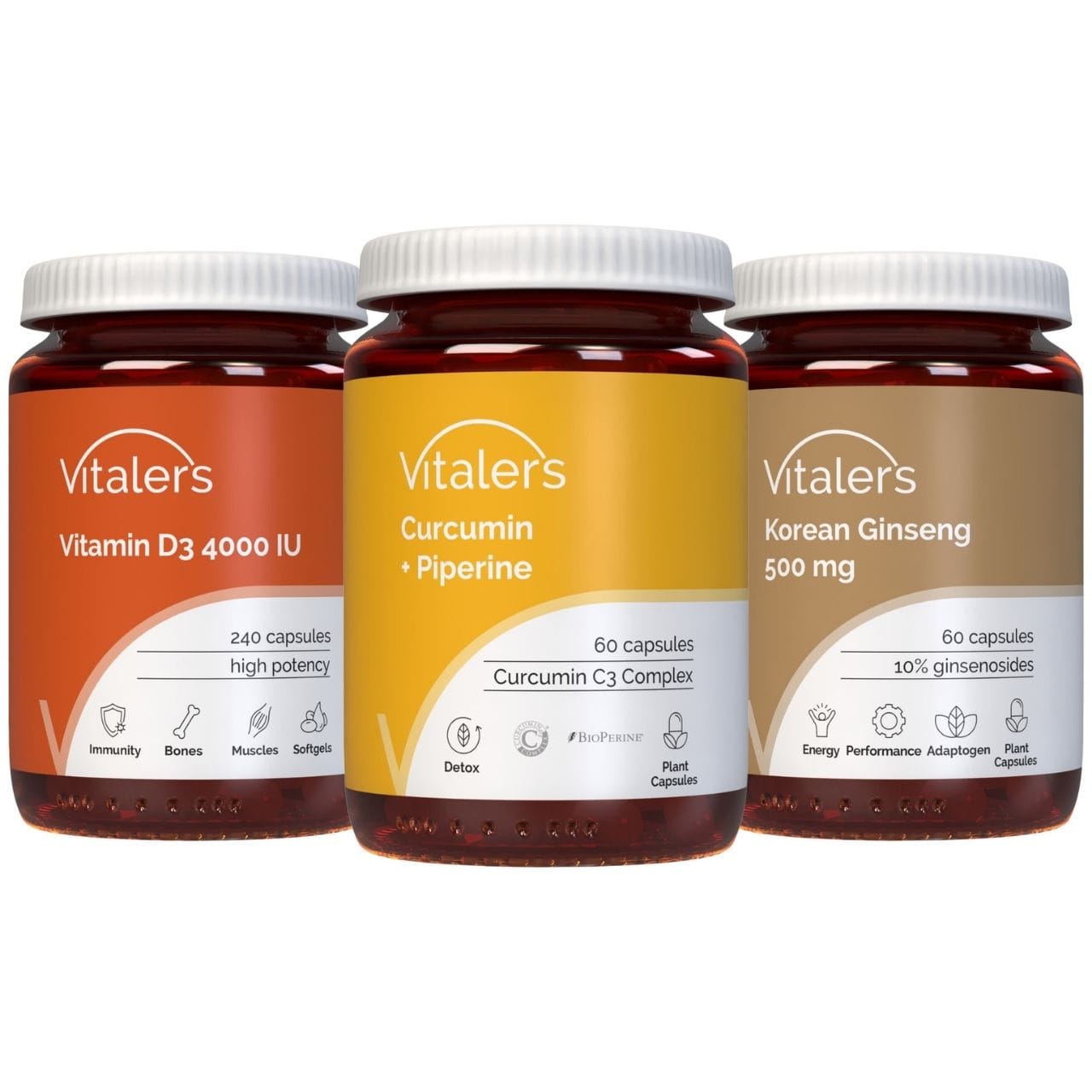 Vitaler's Spring Awakening is a combination of three supplements that will help you feel full of energy after the winter months. Korean ginseng improves concentration and boosts energy, vitamin D3 supports the immune system and bone health, and curcumin with piperine has an anti-inflammatory effect and supports the joints. The whole set has a comprehensive effect, providing natural support on a daily basis, especially during transitional periods.